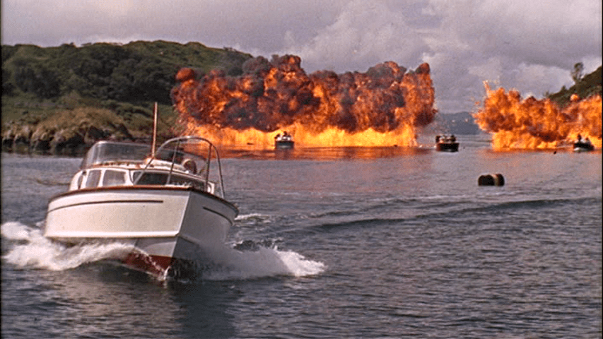 Bond and the extremely-rufied Tatiana get off the train and get away. They are soon attacked by a helicopter that throws grenades and shoots at them. Bond ultimately escapes, and two escape again after they are pursued in a tense powerboat chase.