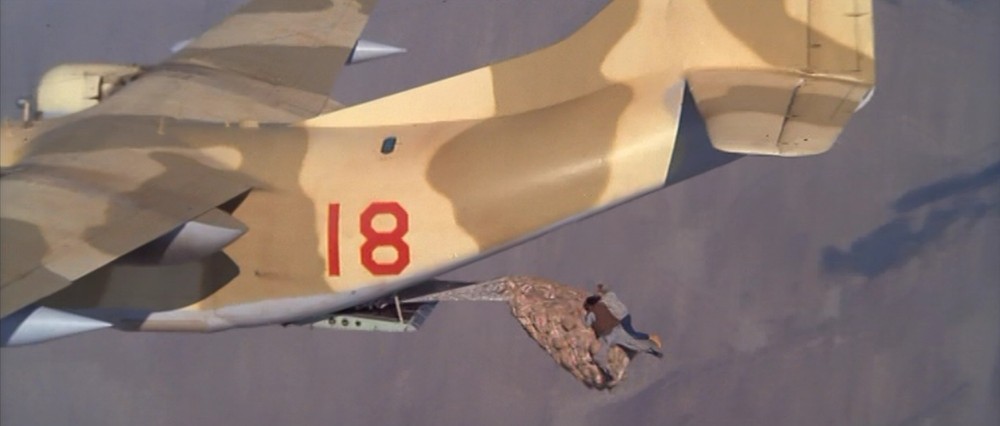 The truck is carted onto the base and driven into the back of a big-ass plane. Bond loads a bomb on the plane in an opium bag and sets it for ten and half minutes. Just as he’s about to the leave, the back-ramp closes. Bond decides to exit via the side entrance, right where Koskov and Necros are entering. Bond abducts a gun from a soldier and starts firing. Right then, the Mujaheddin come and start fuckin’ some shit up. Bond starts driving the plane as everyone scrambles around amidst gunfire and explosions. Before taking off to the sky, Kara drives a truck into the plane. They takes off and Bond goes to diffuse the bomb, when Necros is there to cause him trouble. After a fight hanging out the back of a plane, Necros falls to his death. Bond climbs back aboard safely, but hears the ticking bomb. Bond quickly finds it amongst the nondescript bags and defuses it with 2 seconds left. Bond later throws this bomb out of a plane to stop some Soviet baddies advancing on his Mujaheddin friends.