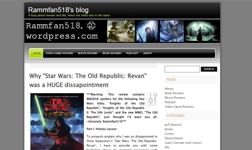 rammfan518.wordpress.com (and later rammfan518.com) was a blog that I ran from Feb 2007 to 2015. While the site is still active and live, I have not updated it or written for it since 2015. From 2007-2011, posts were frequent. At the height, the blog had around 210 articles, with topics mainly going over reviews and thought-pieces regarding movies, video games, television, and other media. The subtitle of the website was “A blog about movies and life, which are often one and the same.” Rarely, a post about real life would seep in there.